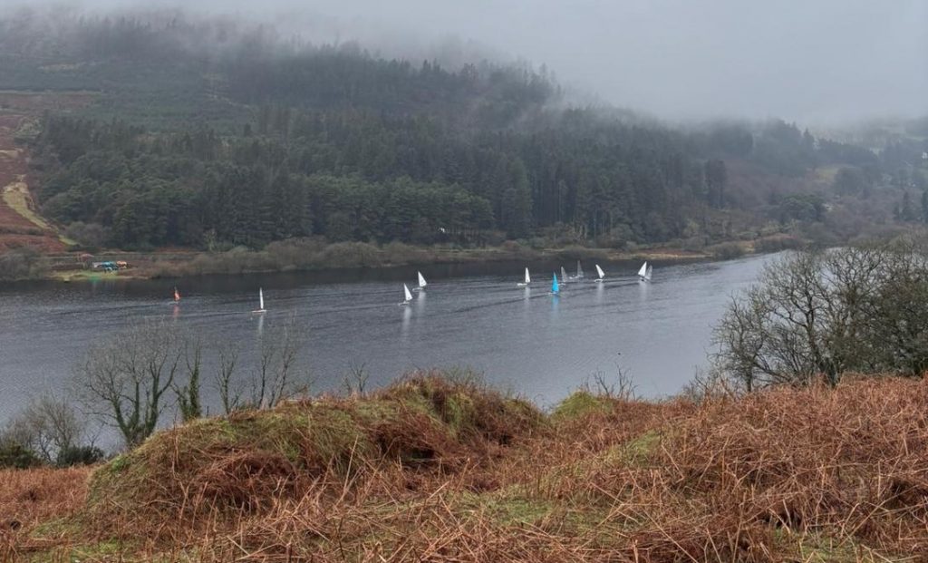 After the week’s Easterly gales and the high tension invoked by the first round of the 6 Nations it was good to see a little soothing sunshine through the mist over Injebreck on Sunday morning with a light southerly wind driving a few ripples up the lake. (Better than last week when there was no wind at all so no racing.) 13 dinghies took to the water in very light conditions and drifted up the lake to the start line area only to see that the course would require them to sail back south into the doldrums v. Happily a little more breeze settled in just before the start, favouring the pin (East) end of the start line where your correspondent in the Finn found himself at the gun. Click here for the full report – Watling Streetworks Winter Series – 8 February 2026